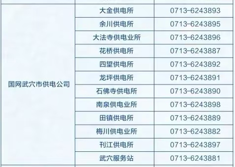 武穴市供电公司强运维、保供电、优服务,全天24小时与您相伴,绝不打烊,竭诚为您服务。如果您有任何有关用电方面的需求请拨打我们的属地供电站所24小时值班电话,我们已按照各供电区域将详细的供电服务电话整理如下,请您查收。
