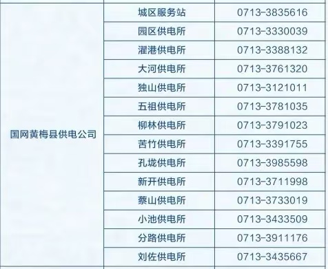 黄梅县供电公司强运维、保供电、优服务,全天24小时与您相伴,绝不打烊,竭诚为您服务。如果您有任何有关用电方面的需求请拨打我们的属地供电站所24小时值班电话,我们已按照各供电区域将详细的供电服务电话整理如下,请您查收。