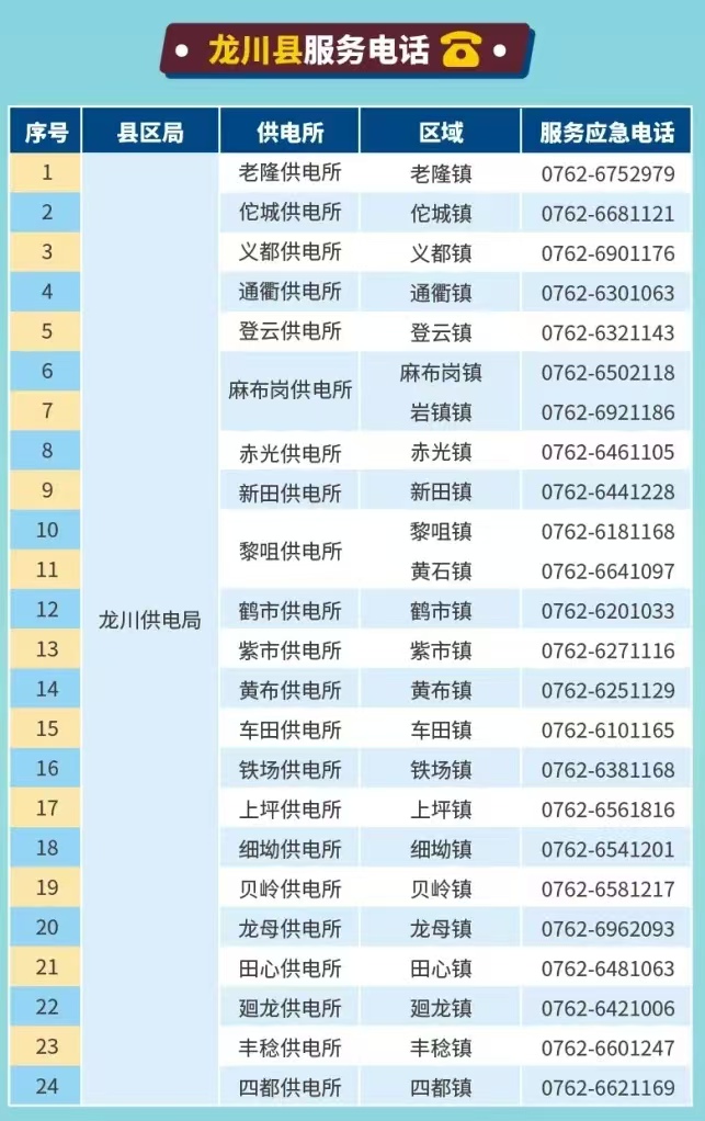 说明:关于龙川县供电公司各属地供电所应急服务电话的信息仅供参考。
