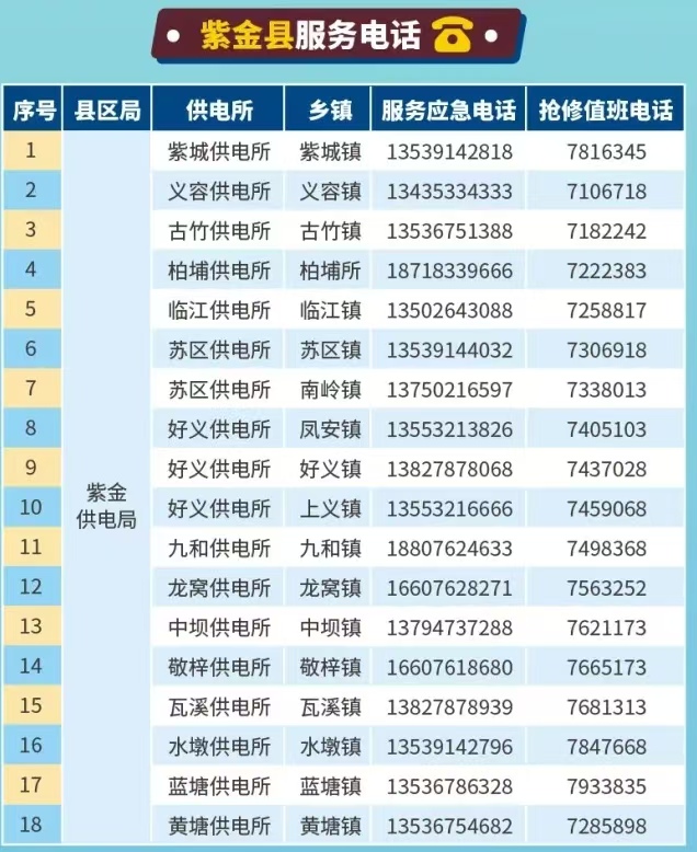 如遇用电问题请及时拨打各属地供电所应急服务电话。紫金县供电公司24小时坚守保供电只为万家灯火明!