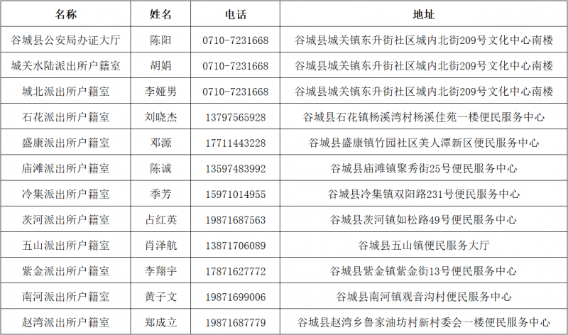 为深化“放管服”改革,进一步提升政务服务质量,方便群众办理业务,谷城县办证大厅和派出所户籍窗口办公电话和地址信息进行公布。
