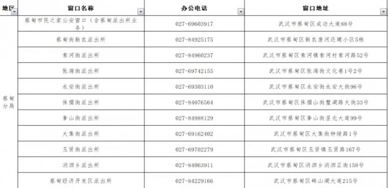 武汉市蔡甸区各派出所户政窗口地址和办公电话信息汇总如下: