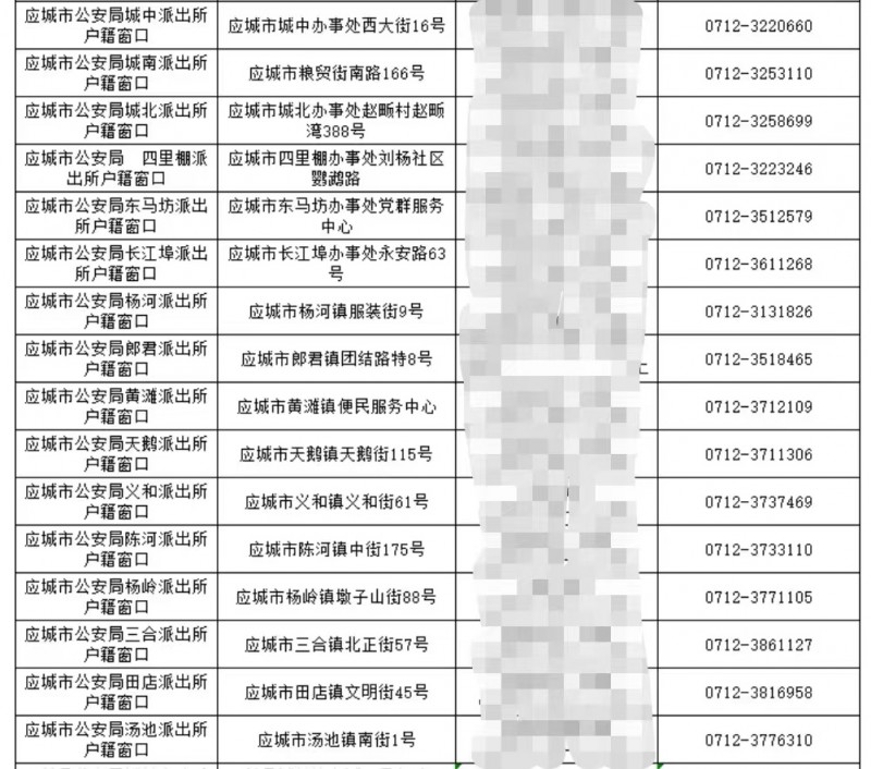 应城市东马坊派出所户籍窗口:应城市东马坊办事处服务中心,咨询电话:0712-3512579