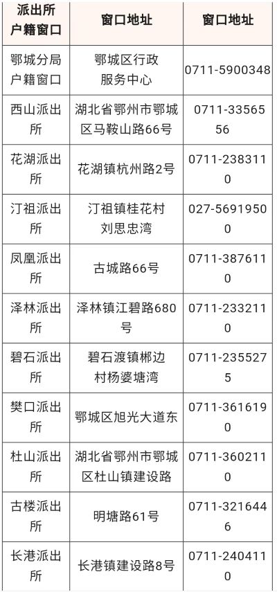 鄂州市鄂城区辖区各派出所户籍业务电话: