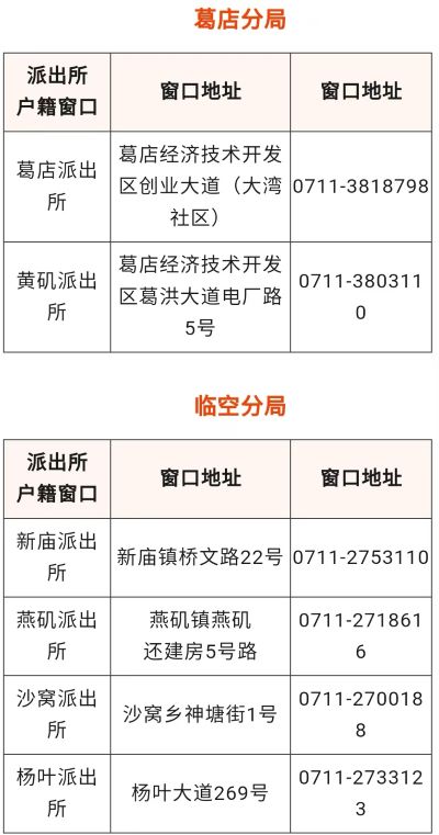鄂州市葛店分局和临空分局区各派出所户籍窗口地址和业务电话信息汇总: