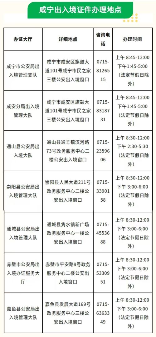 咸宁市全市辖区出入境业务办理地点和咨询电话: