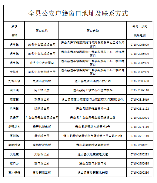 通山县全县各辖区派出所户籍窗口地址和联系电话信息表如下: