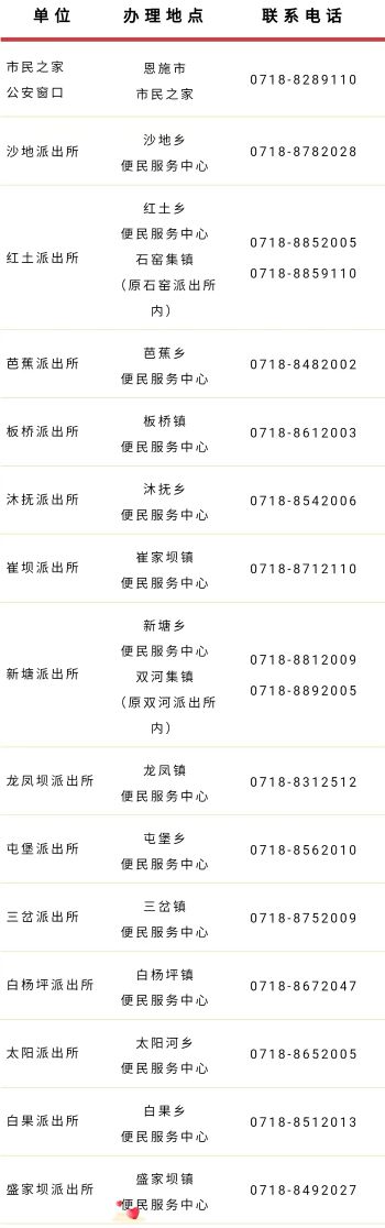 说明:关于恩施市各派出所户政窗口身份证办证联系电话的信息作出特别说明:本信息立足为社会大众提供有价值的参考资料和办事指南等公共信息,部分图文来源于网络或者有关机构公开内容,属于公益性的分享与传播。虽然尽力确保内容的准确性和实效性,但由于各种因素,难免存在疏忽和差错,敬请不吝赐教,欢迎相互交流,共同学习。对信息中陈述、观点判断保持中立,版权属原作者所有,如涉侵权或者差错等问题,请联系网络信息推广平台秋果黄页网客服(187/8199/3958微信同号),一定会及时删除或者修正。谢谢!