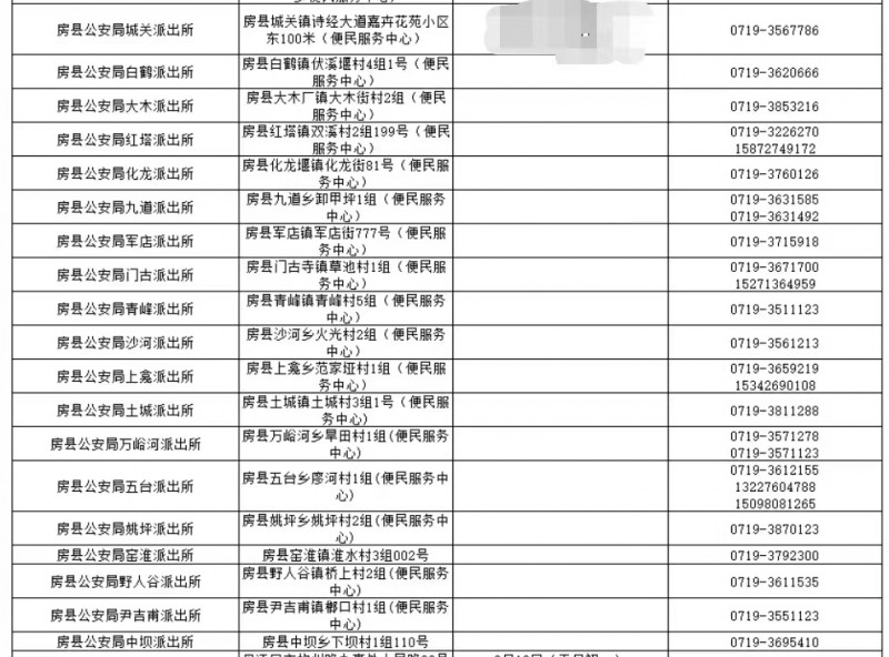 房县全县各辖区派出所户政(户籍)窗口地址和电话信息大全如下: