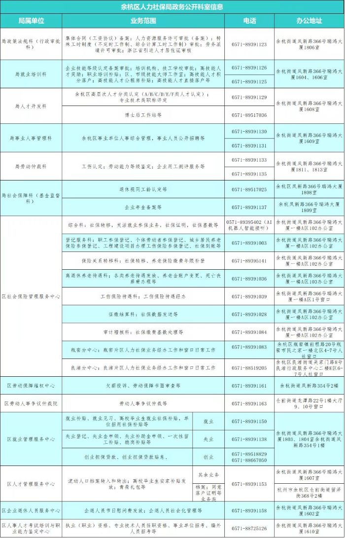 为进一步推进政务服务标准化、规范化、便利化建设,确保业务办理高效有序开展,更好地为群众提供高效便捷的来电服务,杭州市余杭区人力社保局现将局业务科室和劳动保障监察投诉举报热线电话集中进行公示: