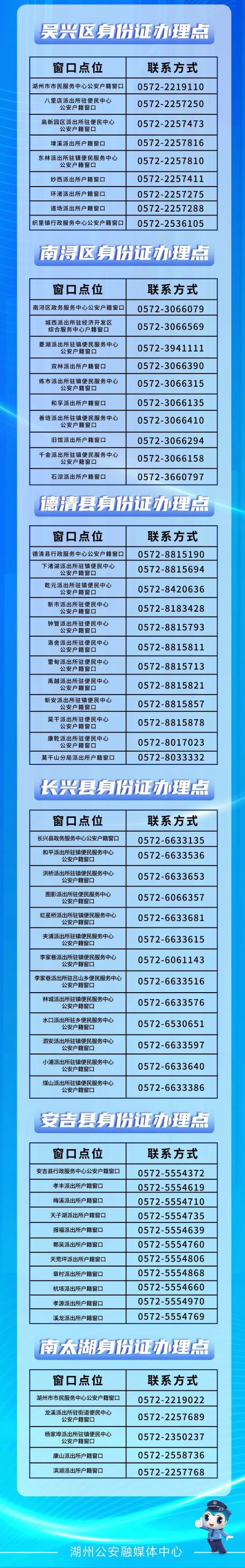 湖州市户政热线(各区县辖区派出所户籍窗口身份证办理地址及电话)信息表如下:
