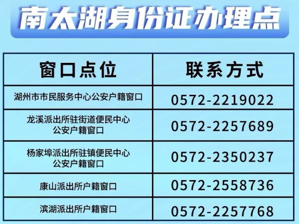 湖州南太湖新区市民服务中心和各派出所户籍窗口身份证办理地址及电话信息表如下: