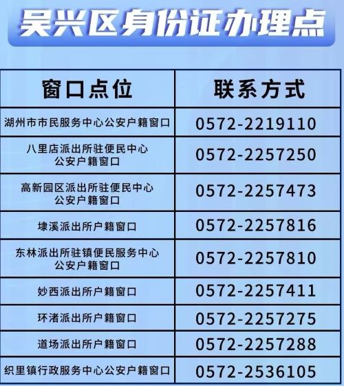 湖州市各区县辖区派出所户籍窗口身份证办理地址及电话信息表如下: