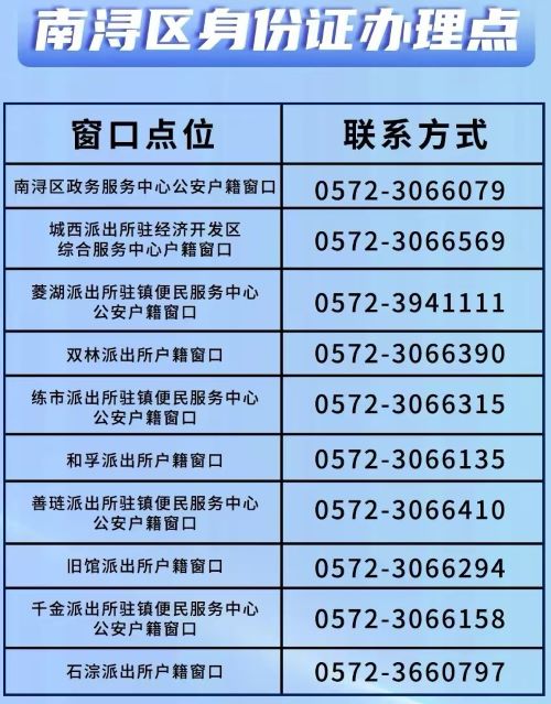 湖州市南浔区政务服务中心户政窗口和各辖区派出所户籍窗口身份证办理地址及电话信息表
