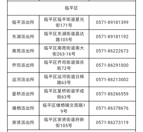 杭州市临平区各辖区户籍派出所窗口咨询电话和办事地址: