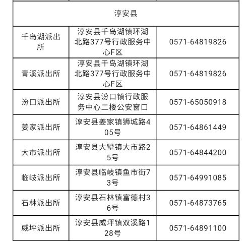 说明:关于杭州市淳安县各辖区户籍派出所窗口咨询电话和窗口地址的信息作出免责声明:关于此信息作出免责声明,此信息图文仅供参考,小编不承担任何法律责任。此信息来源于有关机构的公开内容,在此经过整理并转载,唯一的目的是通过互联网传播便民惠民信息。由于时间等原因,难免使信息发生变更,此信息如有侵权,或者差错,请联系删除,直接联系便民信息平台秋果黄页网客服电话(187-8199-3958微信同号),一定会及时删除和修正。