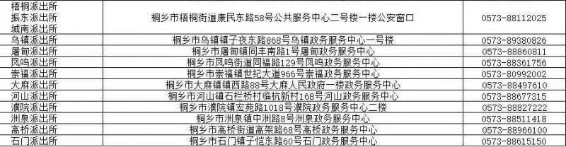 嘉兴桐乡市各辖区派出所户政业务承办窗口地址和咨询电话信息汇总如下: