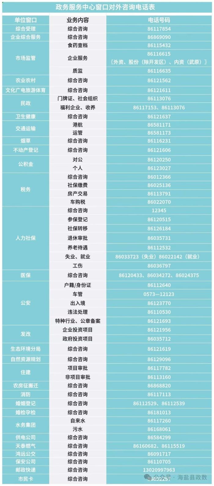 海盐县政务服务中心入驻机关窗口业务咨询电话汇总表: 社保、医保、公积金、营业执照......想咨询办事,0573开头+各窗口专属号热线一拨,省心省力!
