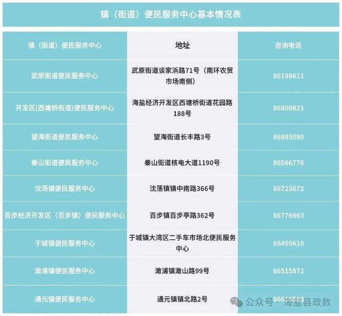 为了让广大市民办事更省心、更省力,现在顺便将海盐县各镇(街道)便民服务中心详细地址和联系电话进行公布如下,快来看看您家附近的便民服务中心在哪吧。