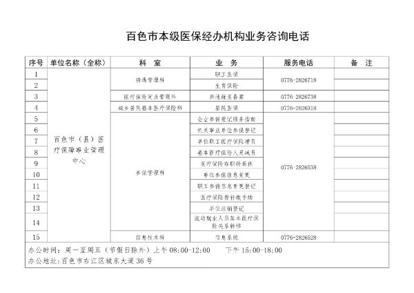 百色市市本级医保经办机构各类业务咨询电话