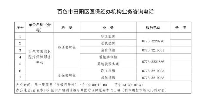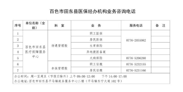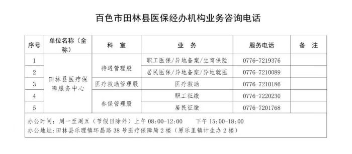 百色市田阳区医保经办机构各类业务咨询电话