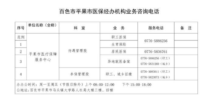 百色平果市医保经办机构各类业务咨询电话