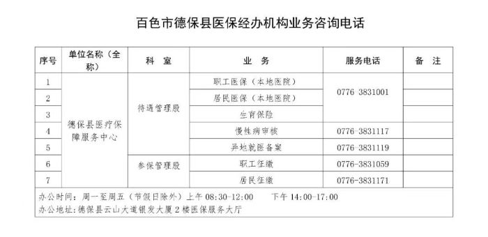 百色市德保县医保经办机构各类业务咨询电话