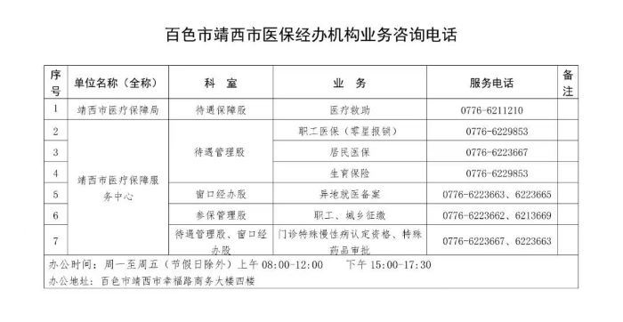 百色市医保热线(百色市各区、市、县医保经办机构业务咨询电话)信息大全如下: