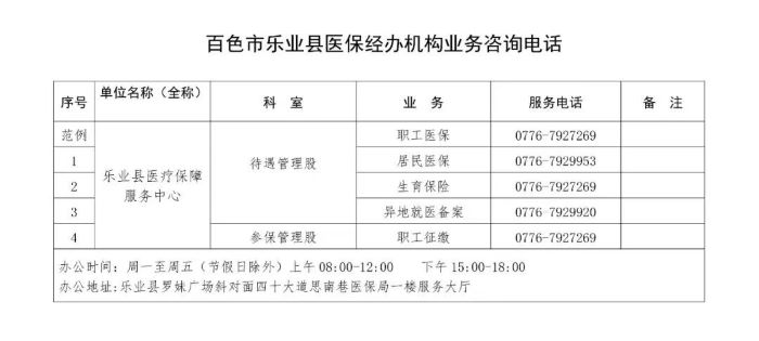 百色市乐业县医保经办机构各类业务咨询电话