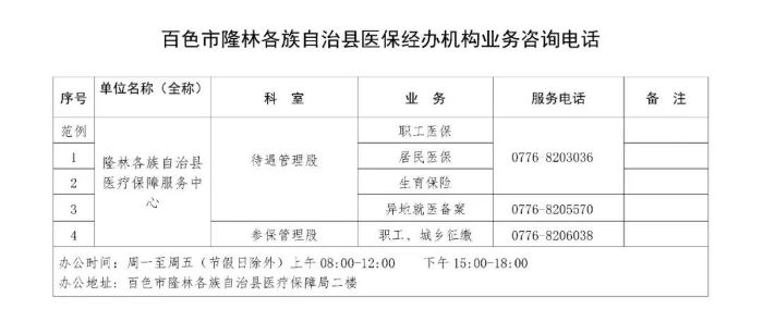 百色市隆林县医保经办机构各类业务咨询电话