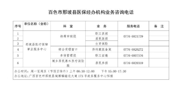 百色市那坡县医保经办机构各类业务咨询电话