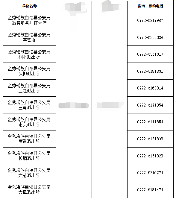 金秀瑶族自治县政务大厅和各派出所户政咨询预约电话:
