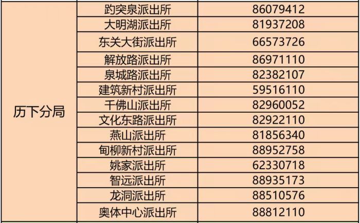 济南市历下区辖区各派出所户政(户籍身份证等)窗口咨询电话: