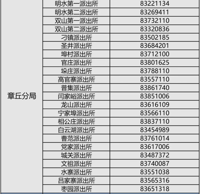 济南市章丘区辖区各派出所户政(户籍身份证等)窗口咨询电话: