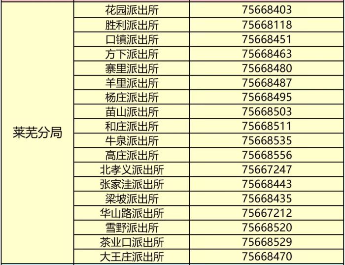 济南市莱芜区辖区各派出所户政(户籍身份证等)窗口咨询电话: