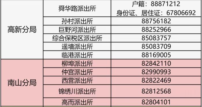 济南市高新区和南山区辖区各派出所户政(户籍身份证等)窗口咨询电话: