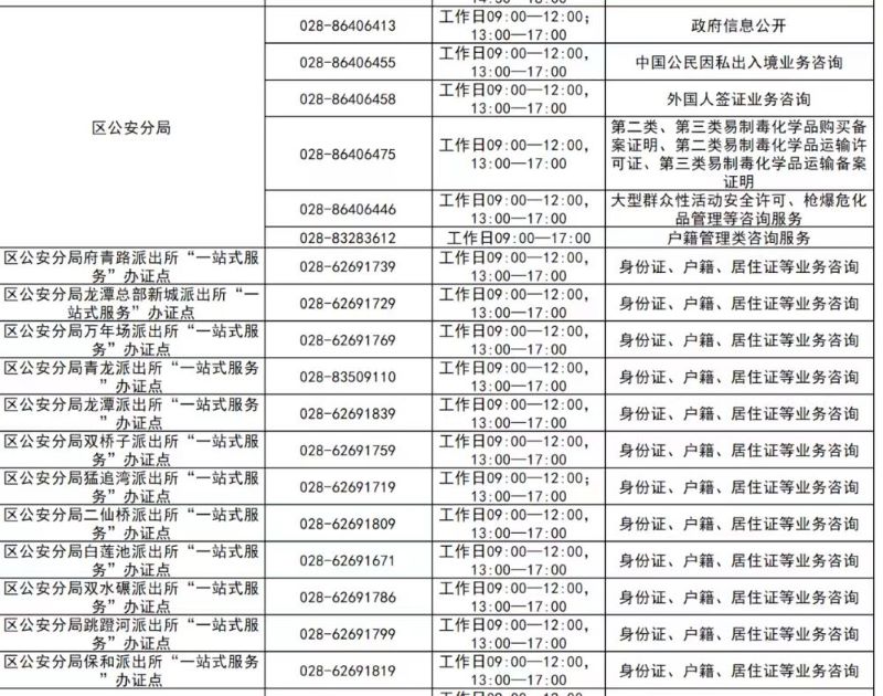 成都市成华区各派出所一站式服务办证点身份证、户籍、居住证等业务咨询电话: