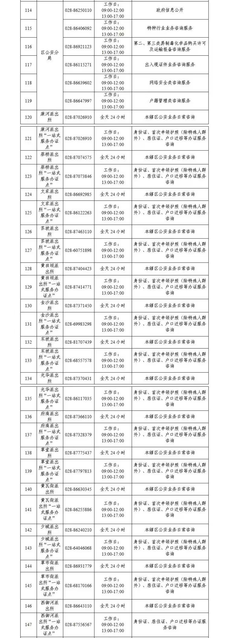 成都市青羊区各派出所值班电话和一站式办证服务点咨询电话信息表如下: