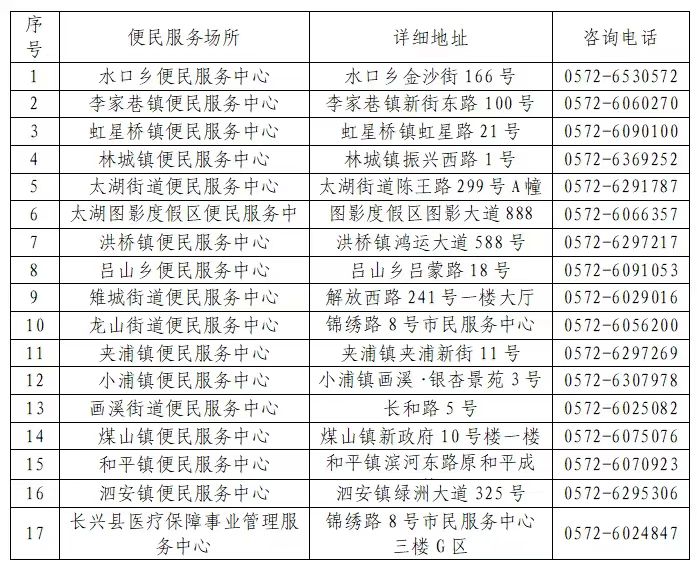 附件:长兴县各乡镇(街道、园区)便民服务中心及县医保中心地址及咨询电话