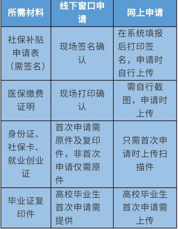 所需材料线下窗口申请网上申请社保补贴申请表(需签名)现场签名确认在系统填报后打印签名,申请时自行上传医保缴费证明现场打印确认需自行截图,申请时上传身份证、社保卡、就业创业证首次申请需原件及复印件,非首次申请仅需原件只需首次申请时上传扫描件毕业证复印件高校毕业生首次申请需提供高校毕业生首次申请需上传