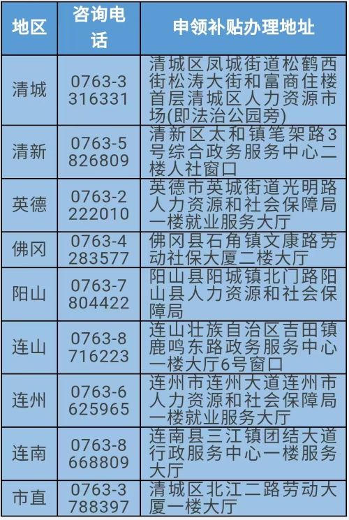 五、清远市各县(市、区)灵活就业社保补贴补贴申领地址及咨询电话