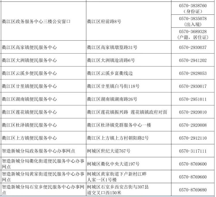 衢州市衢江区各辖区派出所身份证户籍政务服务综合窗口地址及联系电话如下: