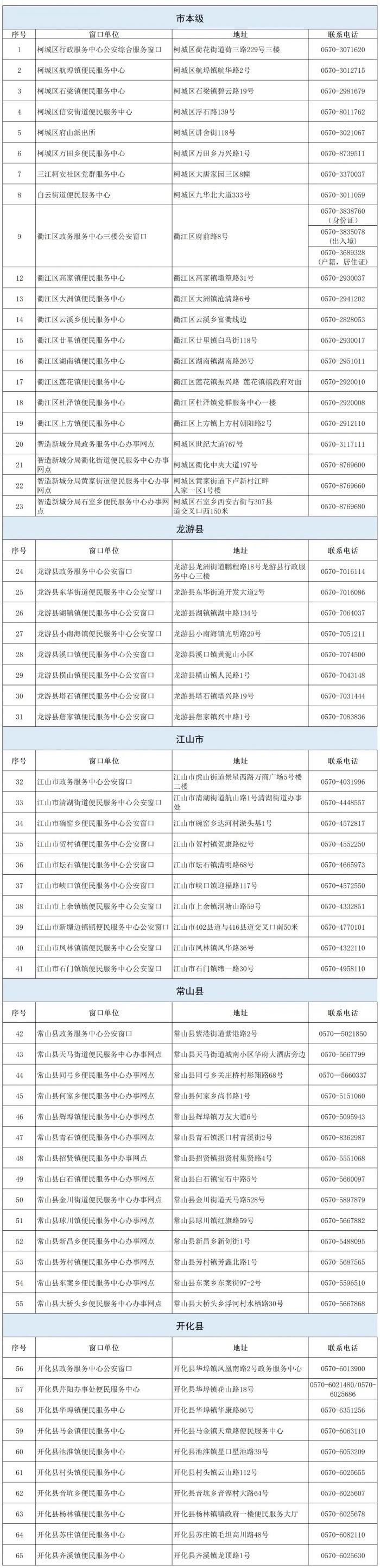 衢州市户政热线(衢州各区、市、县政务中心和派出所户籍窗口地址及联系电话)信息表如下: