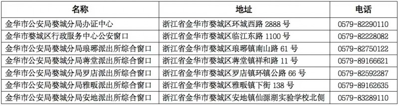 金华市婺城区分局已在办证中心、区行政服务中心窗口、开设户籍业务的派出所设立办证点。办理地址及联系方式如下: