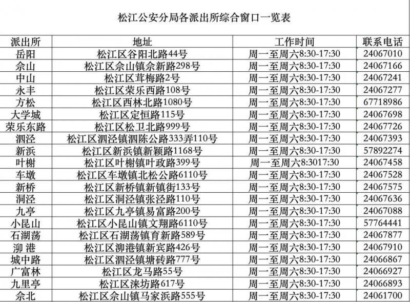 上海市松江区各户政窗口身份证办理地点地址和联系电话信息一览表: