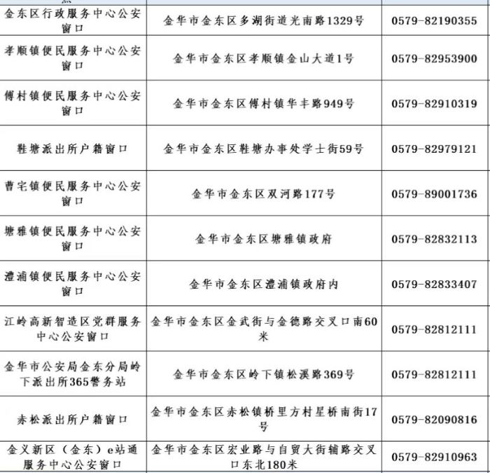 金华市金东区政务服务中心和各派出所户籍窗口地址及联系电话: