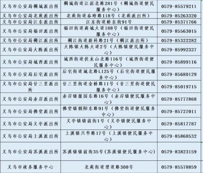 金华义乌市政务服务中心户政窗口和各派出所户籍窗口地址及联系电话: