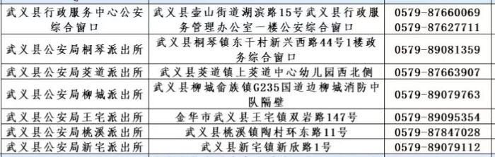 金华市武义县行政服务中心户政窗口和各派出所户籍窗口地址及联系电话: