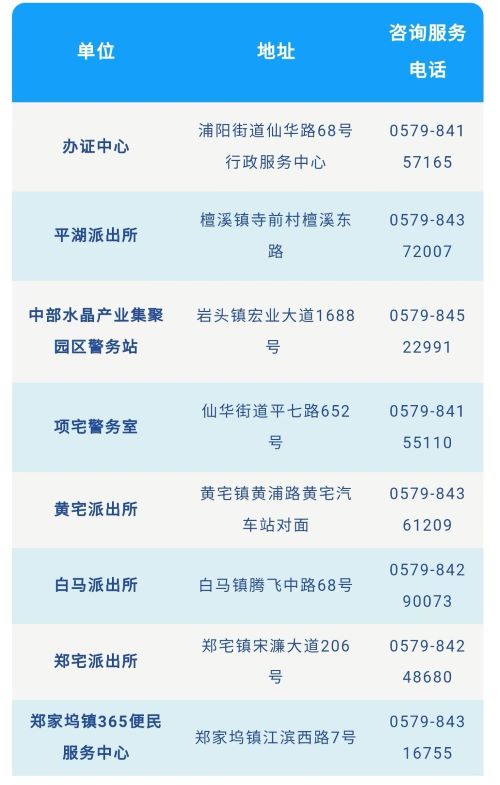 平湖派出所窗口:檀溪镇寺前村檀溪东路,咨询电话:0579-84372007