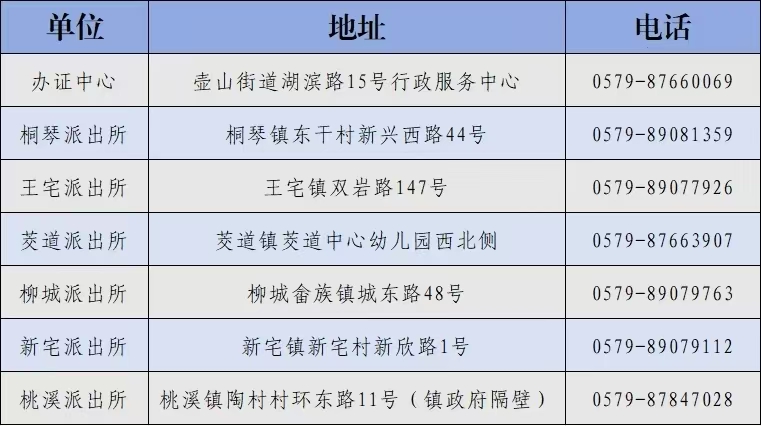 武义县各户政窗口身份证办理地址和业务电话信息表如下: